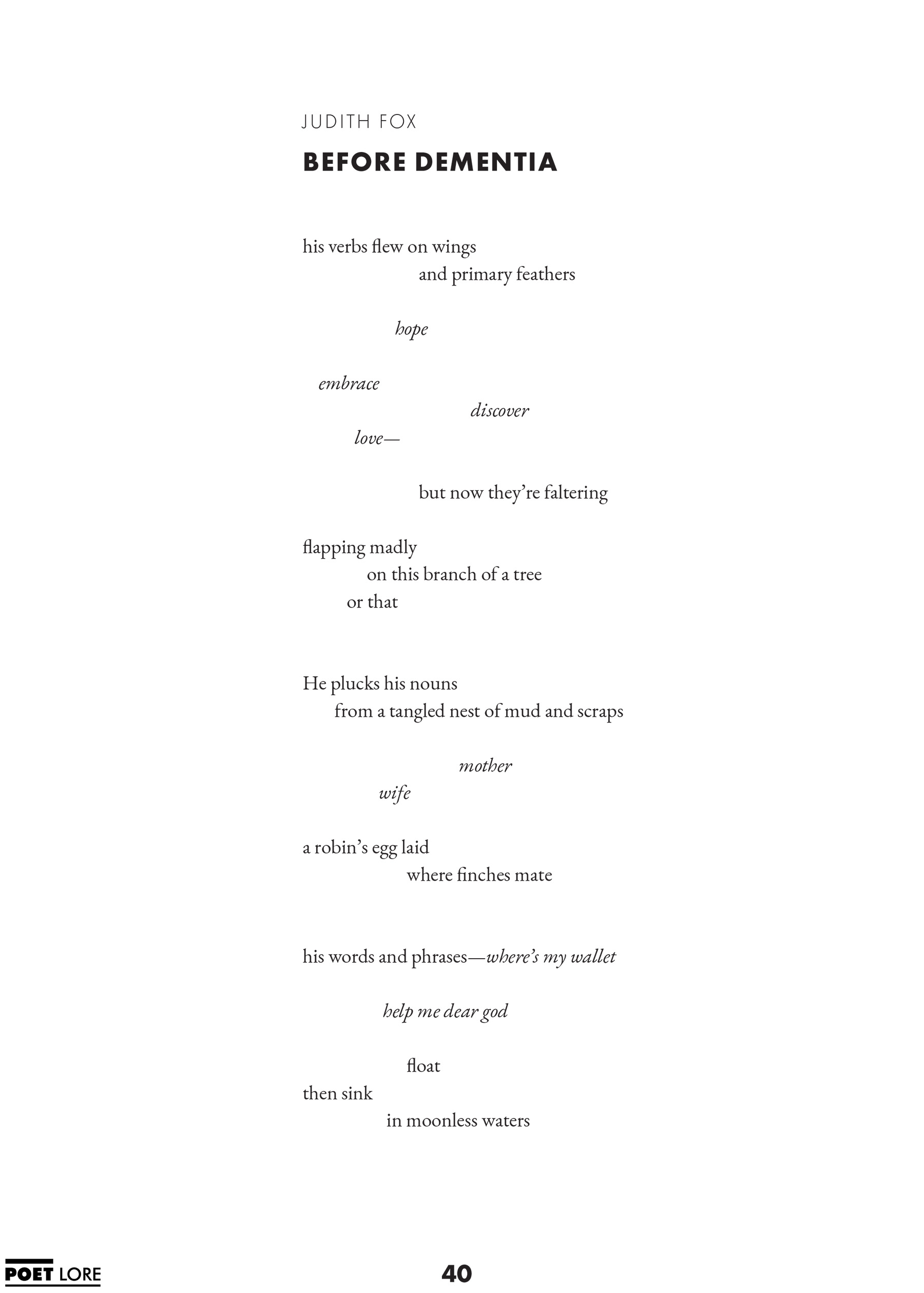 - Calyx – Vol 34:2 – Dementia – https://www.calyxpress.org/shop/34-2/ (the poem is not printed online)