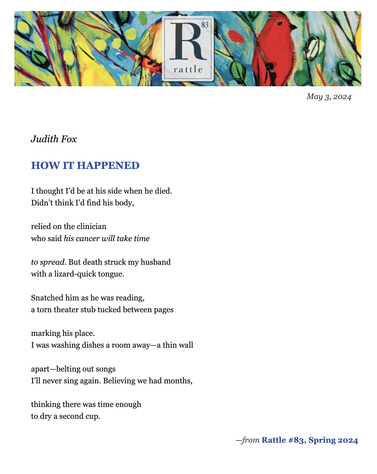 - Rattle – Issue #83 – How it Happened – https://www.rattle.com/how-it-happened-by-judith-fox/